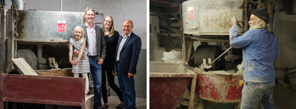 Panmilling is a process of clay production whereby powdered ingredients (or sliphoused base clays in the case of ‘plastic blending’) are blended together with water and sometimes sands and grogs to produce our unique, highly plastic, clay bodies such as Craft Crank and St Thomas bodies. The panmill lifts and turns the clay as it passes under the ‘floating’ granite roller, simulating a kneading action and resulting in an incredibly even distribution of materials and grogs. Panmills offer a much greater control over water content than sliphoused clays. From here, the blended clay is pugmilled before being bagged. Our panmills were used in the manufacture of Cadbury’s chocolate in a former life: Potclays purchased them in the mid-sixties and they are still going strong.