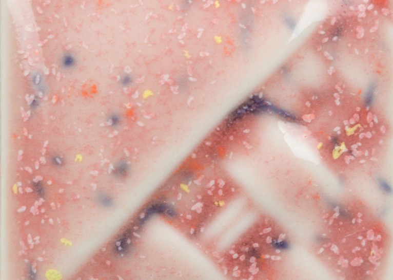 Cone 6 results: Satin-matte, semi-opaque light pink that breaks over texture. Contains small purple, orange and yellow specks. Stable glaze.