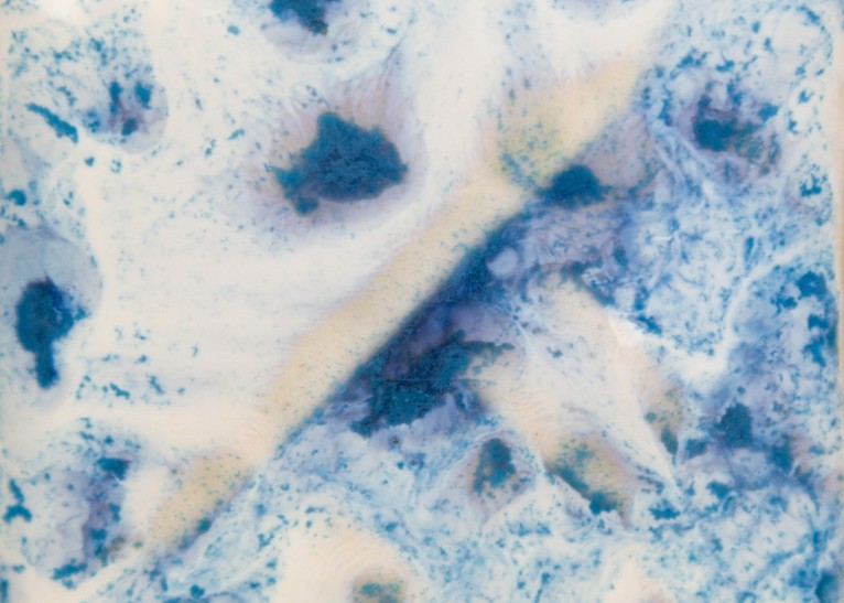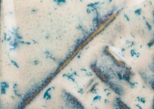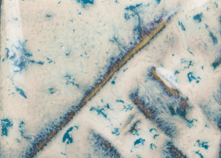 Cone 6 results: Glossy, transparent white glaze that breaks over texture. Contains blue crystals. Base color is stable, crystals can create movement.
